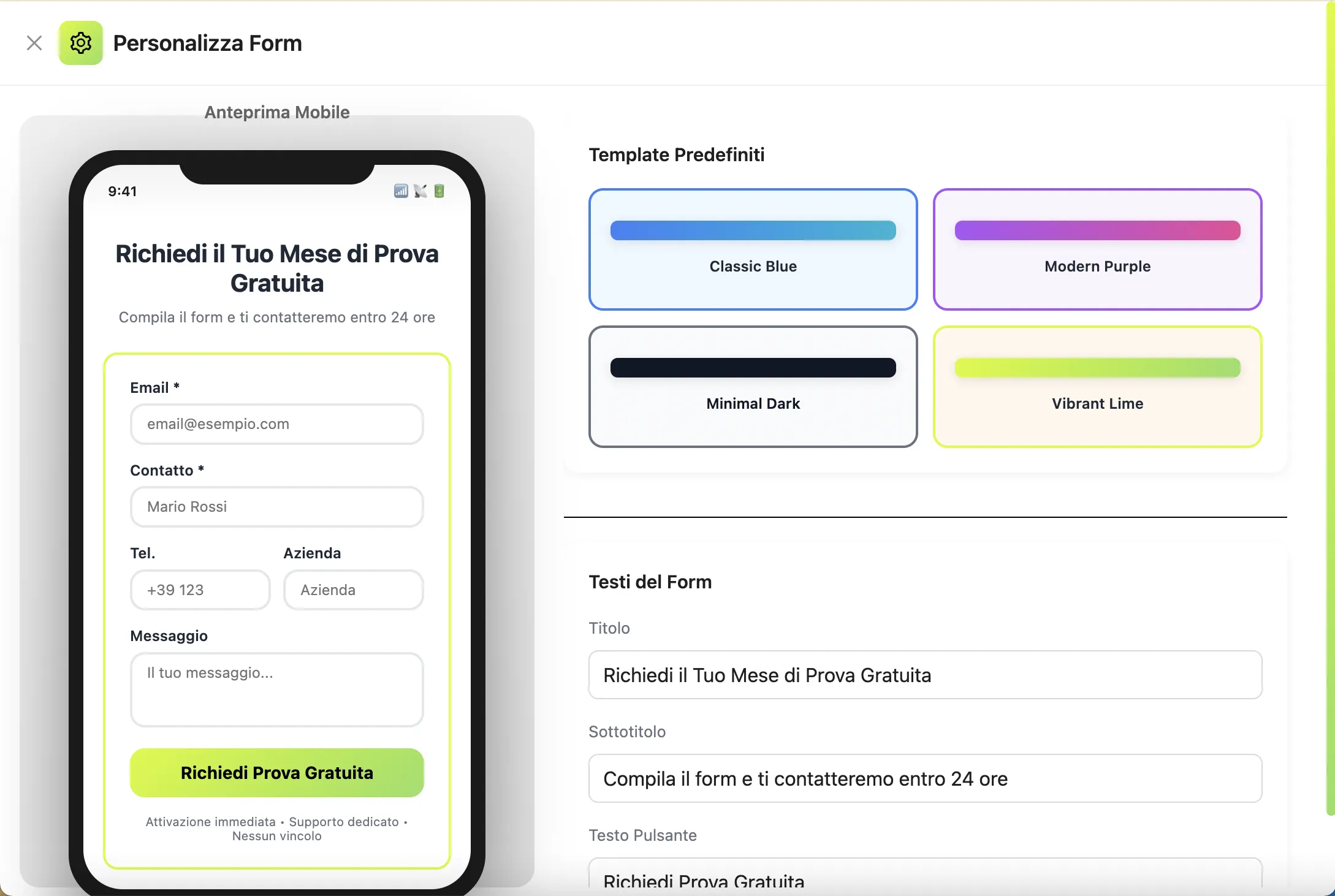 Form personalizzati con raccolta compilazioni integrata, landing page personalizzate, analytics complete e raccolta recensioni automatica.